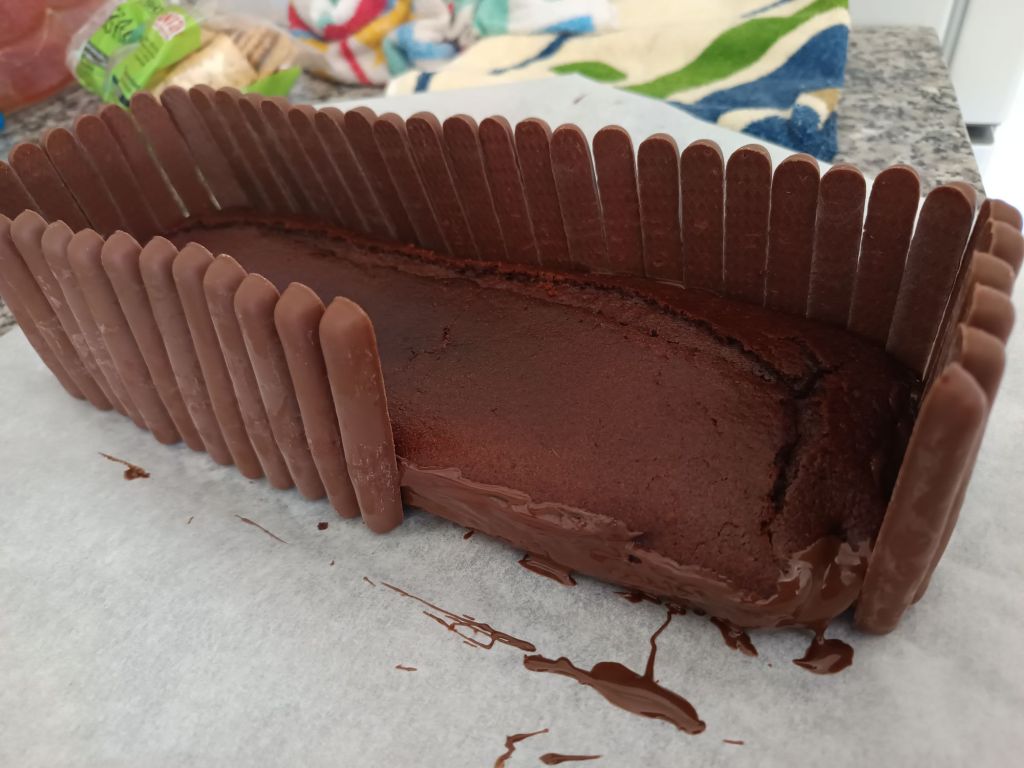 -una vez el bizcocho esté frío lo podemos decorar. Primero decoramos el contorno y para ellos fundimos un poco de chocolate de cobertura y con una cuchara untamos todos los bordes del bizcocho para pegar los palitos que van por todo el contorno