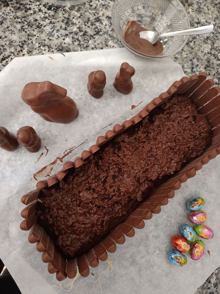 Este año, para mi sobrina le hemos preparado una mona de Pascua que simula un jardín. La base es un bizcocho de chocolate, pero podéis hacerlo del sabor que más os guste. He utilizado un molde rectangular y para decorarla he comprado bastoncitos de chocolate para el contorno del bizcocho, huevos y figuras de chocolate para colocar en la parte superior y para darle un toque crujiente he mezclado cereales Korn Flakes con chocolate de cobertura. También le podéis dar un toque de color con gominolas, Lacasitos…